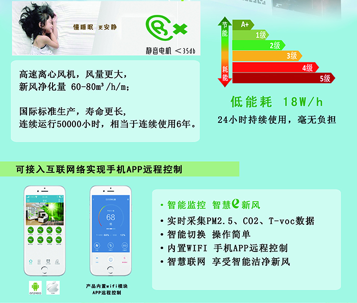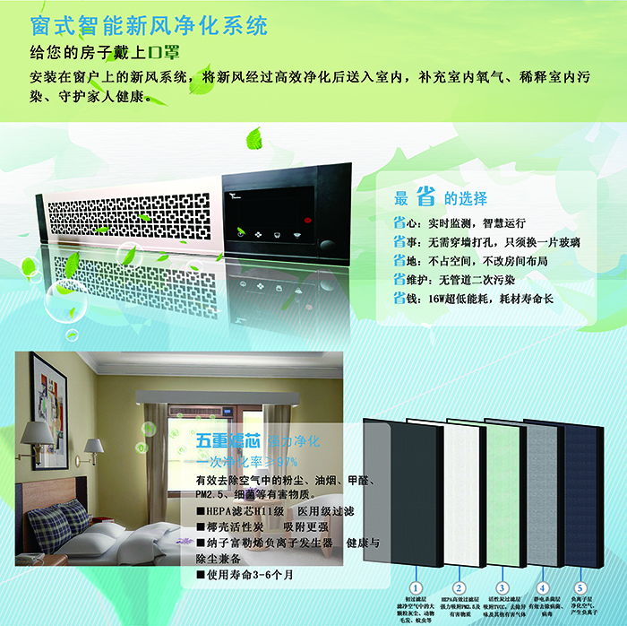 采用实时环境监测,多重过滤净化,智能控制三大模块,结合双风道设计,室外新风引入,室内空气单独净化两大大功能自由切换。